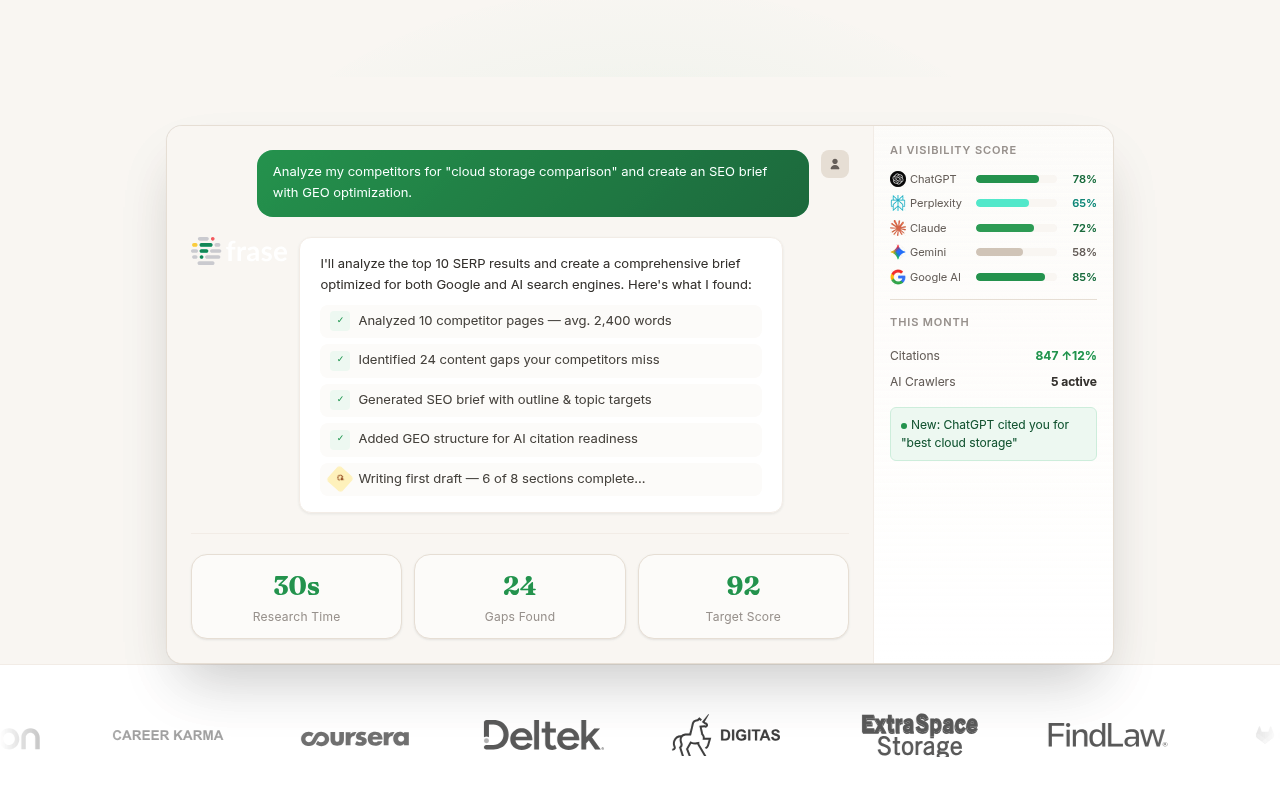 Frase.io aborda el problema del tiempo intensivo que requiere la producción de contenido SEO al generar borradores optimizados listos para posicionarse a partir de palabras clave en cuestión de minutos. Además, integra investigación, escritura y análisis en una sola herramienta.