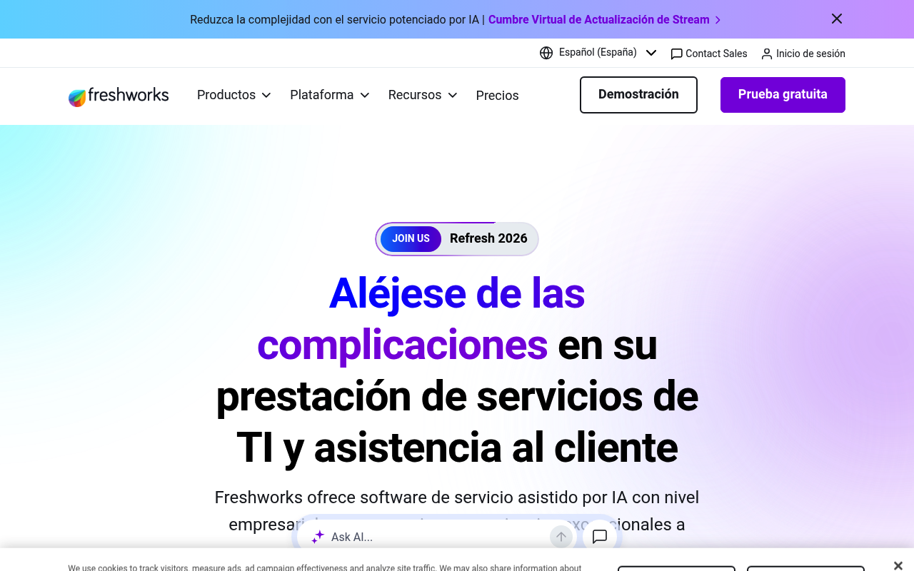 Freshworks es una plataforma en la nube que optimiza la experiencia del cliente (CX) y del empleado (EX) mediante soluciones de servicio al cliente, gestión de servicios de TI (ITSM) y gestión de activos de TI (ITAM). Su objetivo es simplificar la complejidad operativa automatizando el soporte al cliente, las solicitudes de servicio de TI y los flujos de trabajo empresariales.