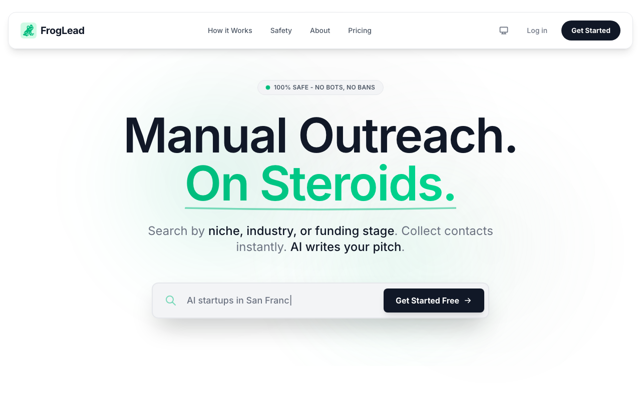 FrogLead es una herramienta de CRM (Customer Relationship Management) basada en IA diseñada para facilitar el alcance manual en LinkedIn. Permite a los usuarios encontrar tomadores de decisiones, crear mensajes personalizados y mantener el seguimiento de las interacciones.