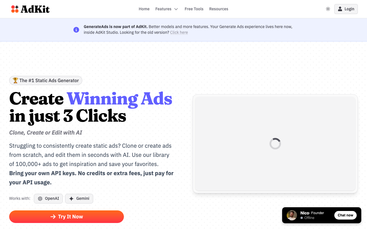 Su propuesta se centra en anuncios estáticos, con un flujo muy directo: crear, clonar o editar. Destaca por permitir usar una biblioteca amplia de anuncios como inspiración, trabajar con tus propias API keys y evitar un esquema de créditos cerrados. Eso la vuelve atractiva para quienes prefieren costos más previsibles y control sobre el uso.