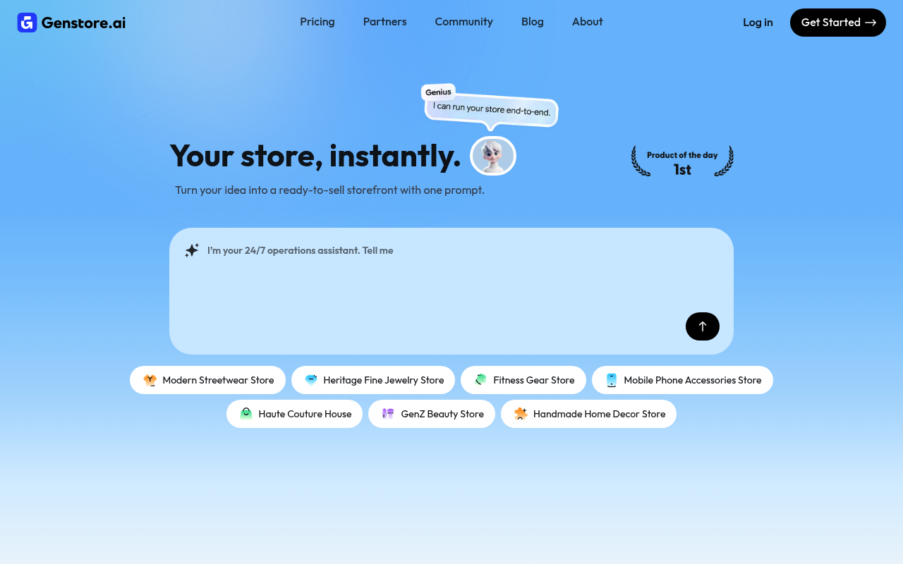 Genstore.ai es una innovadora plataforma de comercio electrónico que utiliza inteligencia artificial para permitir a los usuarios lanzar, operar y escalar tiendas online de manera eficiente. Diseñada especialmente para emprendedores individuales y pequeñas empresas, Genstore.ai automatiza tareas complejas de gestión de tiendas, como la creación de listados de productos, redacción de textos, atención al cliente, gestión de inventarios, marketing y SEO.