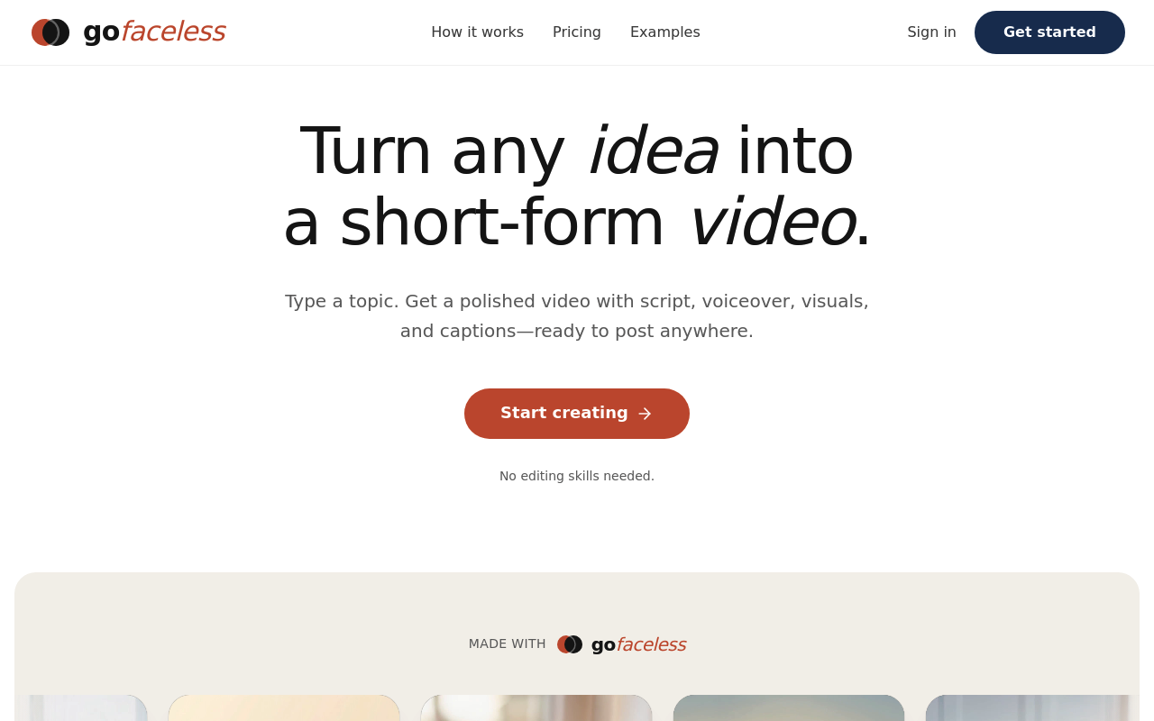 GoFaceless.ai es una herramienta de IA que permite crear videos sin rostro para redes sociales, facilitando la producción de contenido de calidad.