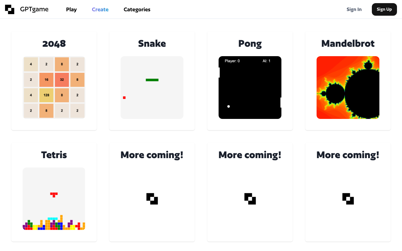 GPTGame es una plataforma que usa IA para generar mini juegos en JavaScript de forma rápida y accesible. La idea es simple: eliges un juego o una plantilla, la IA lo construye y puedes jugarlo de inmediato, incluso si no tienes conocimientos de programación.