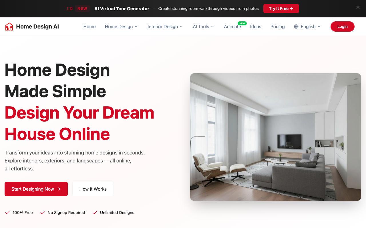 Home-Design.ai es una plataforma web de diseño del hogar impulsada por IA para generar ideas de interiores, exteriores y distribuciones a partir de fotos o descripciones breves. Permite explorar estilos, transformar ambientes y descargar resultados en alta resolución sin instalar software.
