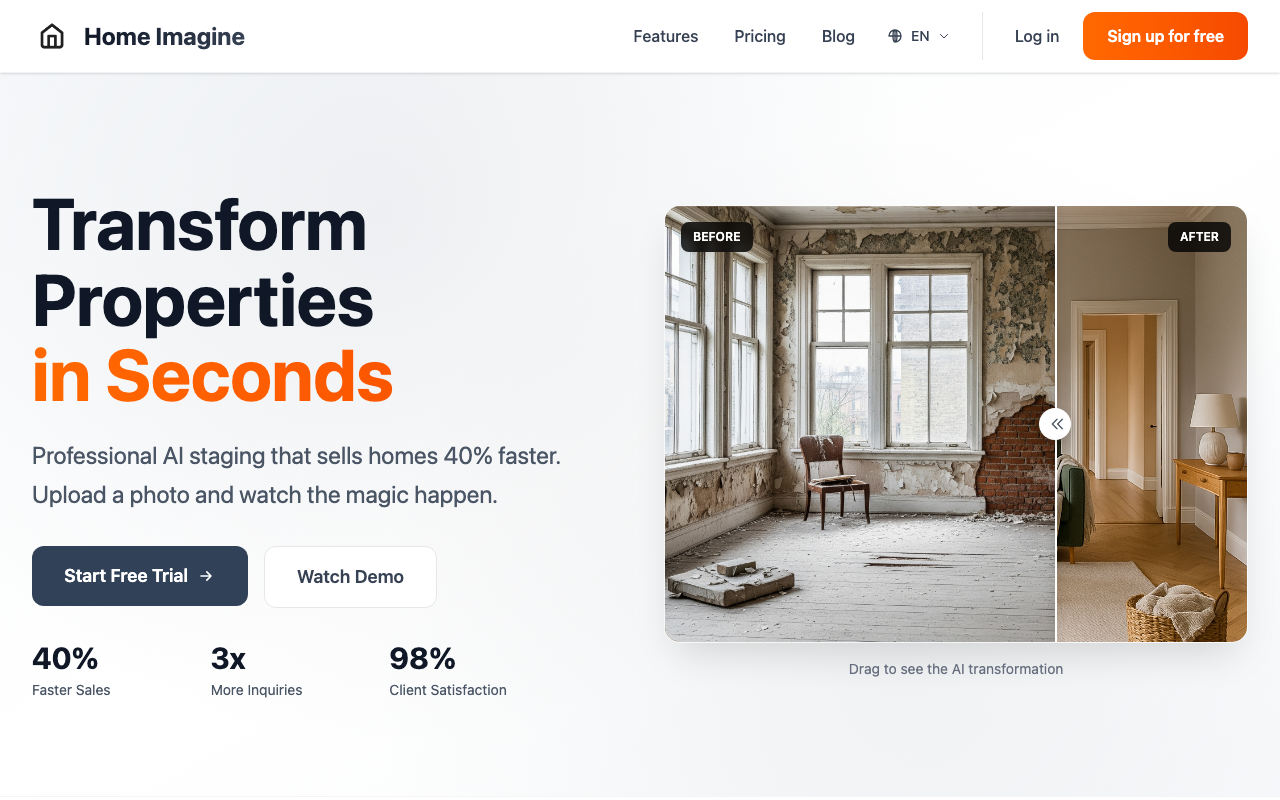 Home-Imagine es una plataforma de IA enfocada en home staging e interiorismo. Permite subir la foto de una habitación, elegir un estilo y obtener una propuesta visual renovada en segundos, con resultados fotorrealistas y pensados para presentación comercial.