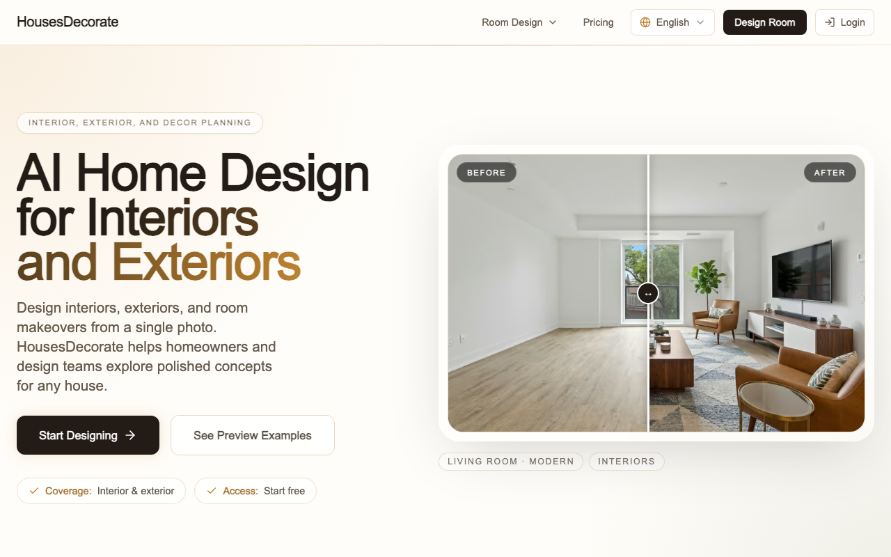 HousesDecorate es una herramienta de inteligencia artificial diseñada para el diseño de interiores y exteriores de hogares. Permite a los usuarios subir una foto de una habitación o una casa completa, explorar diferentes estilos y visualizar diseños potenciales para cualquier espacio. La herramienta es útil para propietarios de viviendas, diseñadores de interiores y equipos de renovación, ofreciendo un flujo de trabajo visual para planificar tanto interiores como exteriores.