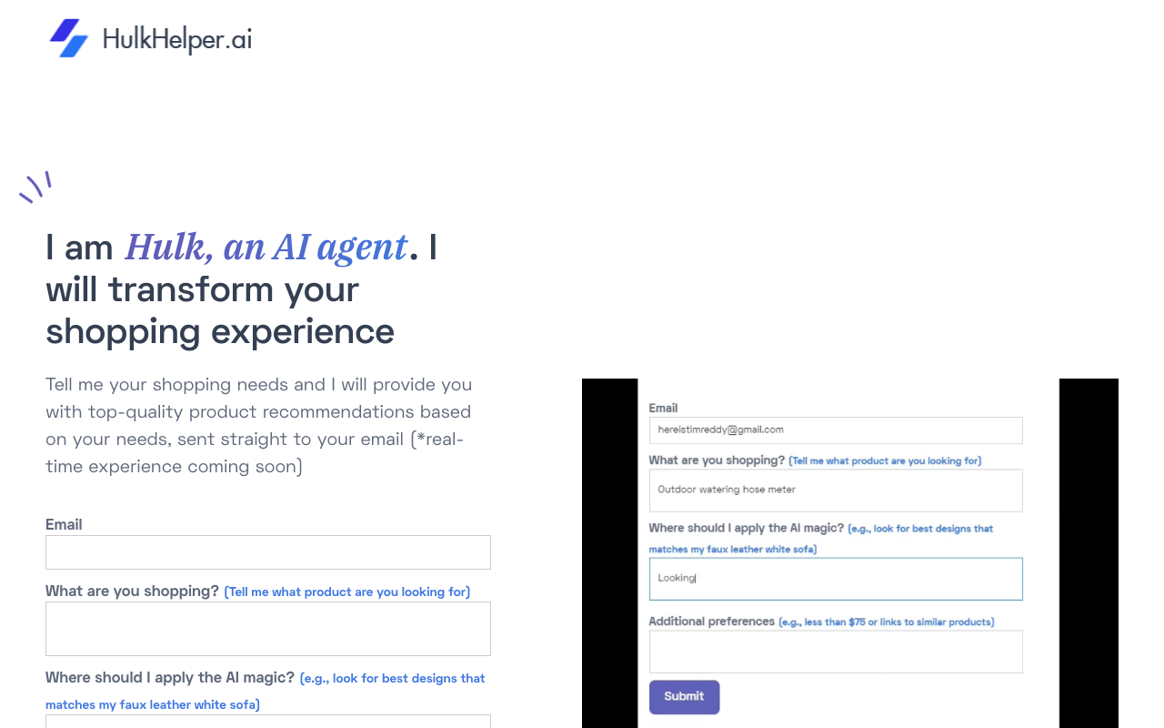 Hulk Helper es una herramienta de IA que mejora la experiencia de compra en línea proporcionando recomendaciones de productos personalizadas a través de correo electrónico. Esta herramienta analiza las necesidades del cliente y ofrece recomendaciones basadas en sus preferencias, incluyendo consideraciones de diseño y presupuesto.