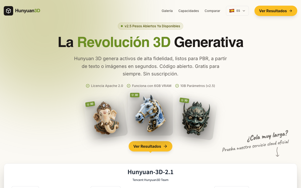 Hunyuan 3D es una herramienta de inteligencia artificial gratuita y de código abierto desarrollada por Tencent Hunyuan. Esta herramienta se especializa en la conversión de texto e imágenes a modelos 3D de alta fidelidad, generando activos 3D listos para producción en segundos.