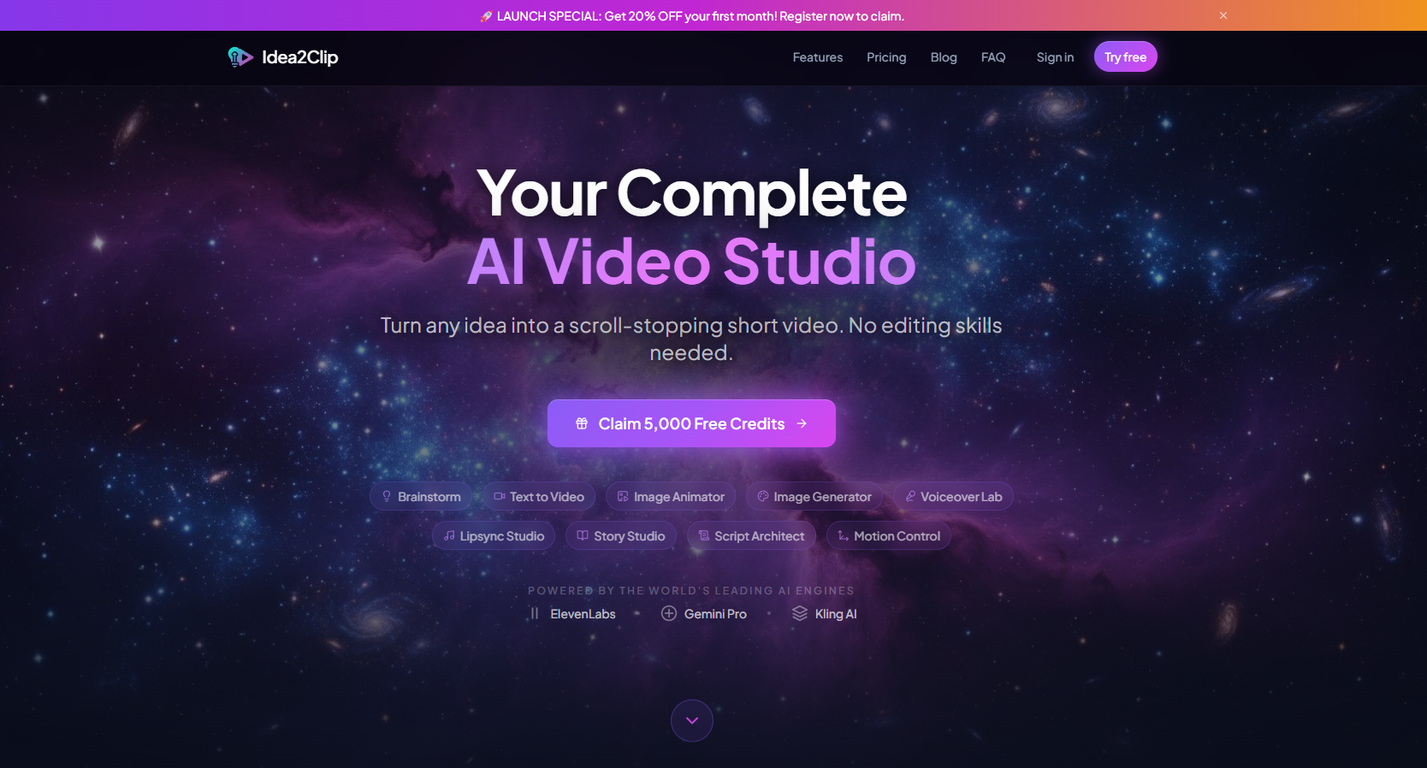 Idea2Clip es una herramienta de producción de videos AI que facilita la creación de clips atractivos para TikTok, Reels y YouTube Shorts.
