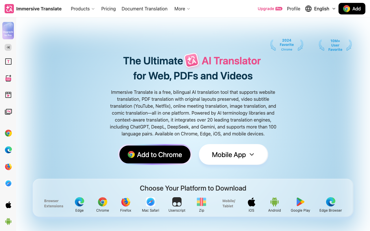 Immersive Translate es una herramienta de traducción AI que ofrece traducciones bilingües cruzadas para páginas web, documentos y subtítulos de videos.