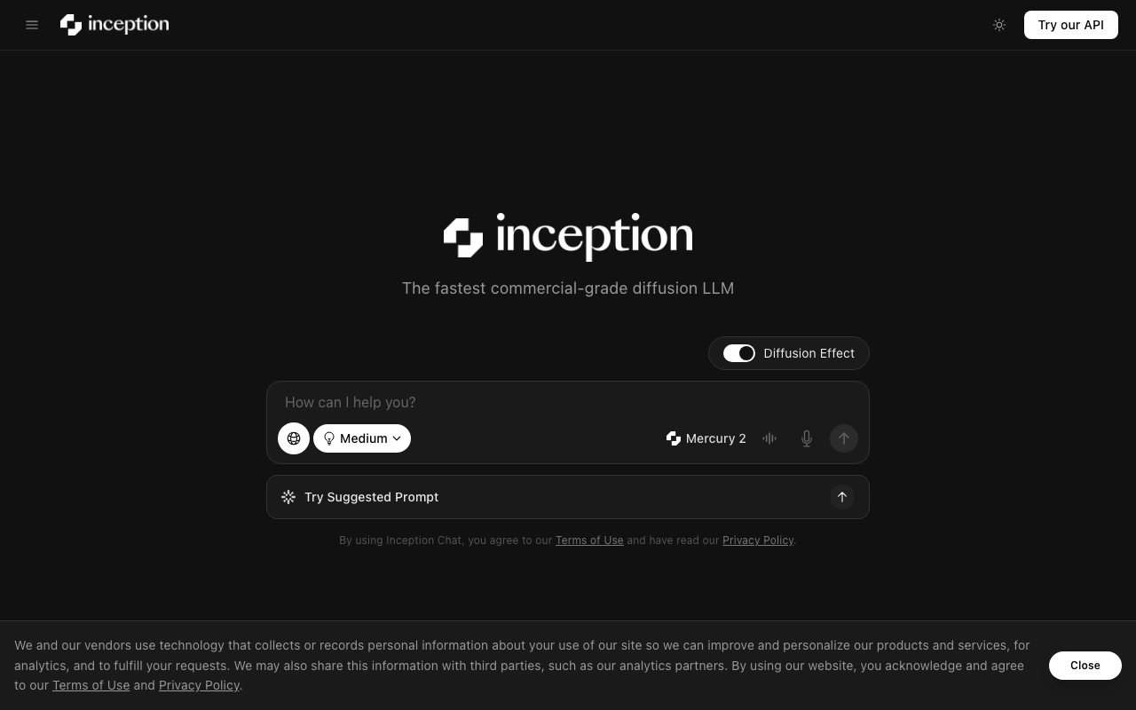Inception Chat es una herramienta de IA desarrollada con un modelo de lenguaje de difusión de grado comercial (LLM). Esta herramienta mejora la velocidad y eficiencia en el manejo y decodificación de estructuras lingüísticas, proporcionando una interfaz intuitiva y características innovadoras que mejoran la comunicación.