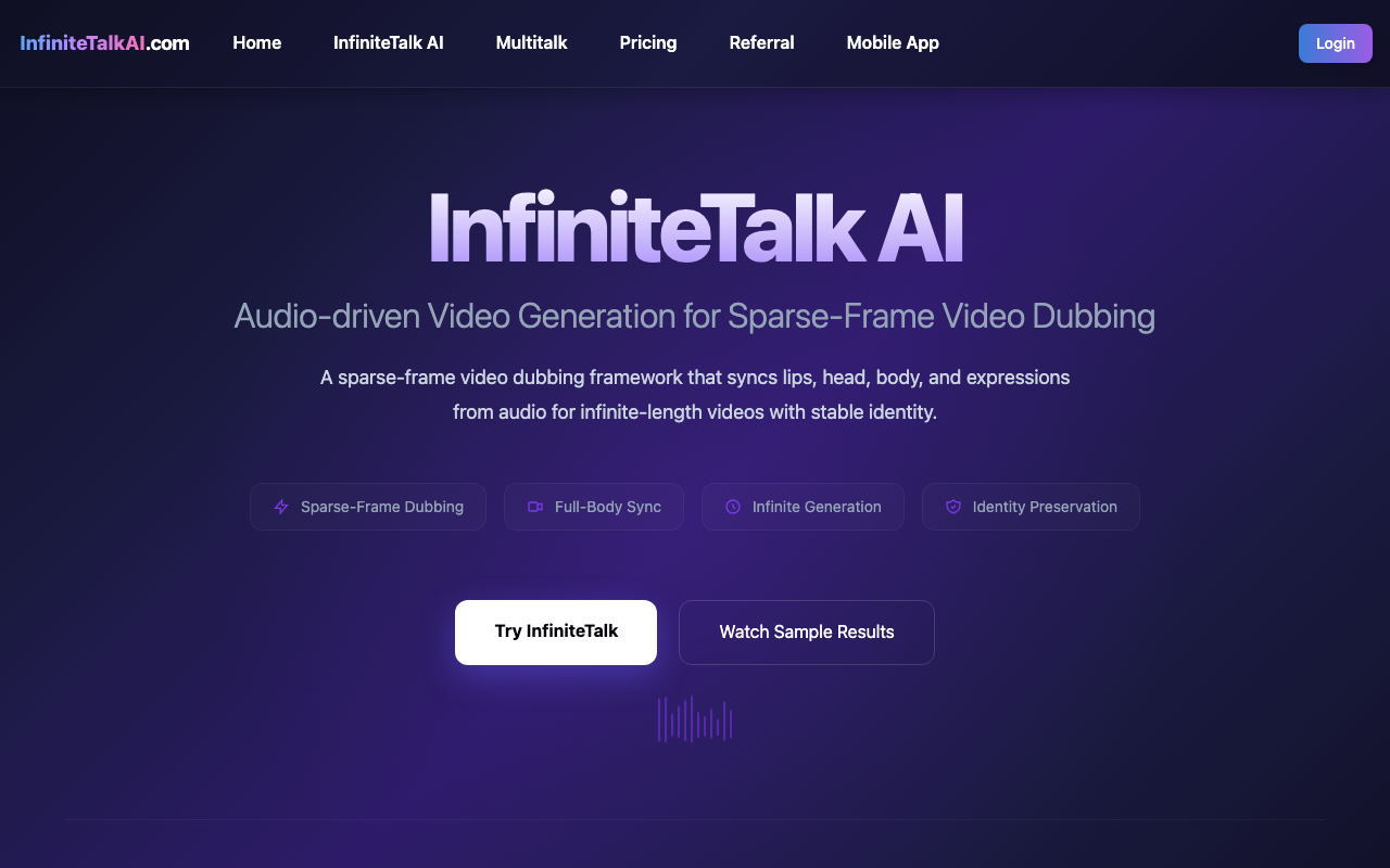 Infinite Talk AI es un generador de video basado en audio que crea avatares parlantes con lip sync muy preciso. La propuesta destaca por permitir convertir imágenes o material de referencia en videos animados que pueden extenderse sin límites, manteniendo la sincronía labial y la coherencia del personaje.