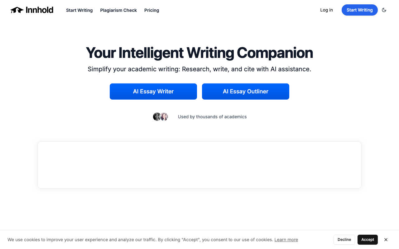 Innhold.ai es un asistente de escritura académica impulsado por IA que ayuda a simplificar el proceso de investigar, redactar y citar. Está orientado a personas que trabajan con textos formales y necesitan avanzar más rápido sin perder claridad ni estructura.