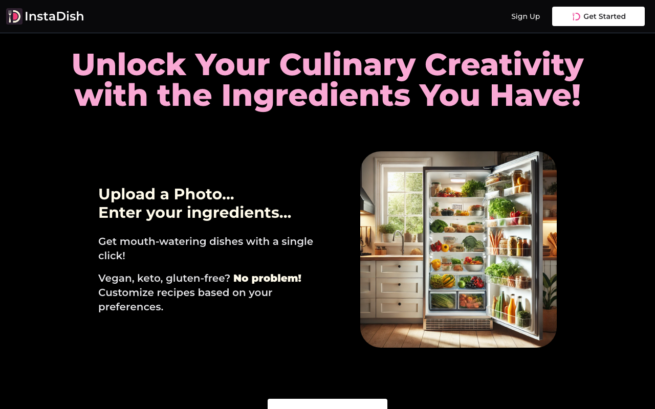 InstaDish es una app con IA pensada para destrabar la cocina cuando no sabes qué preparar o cuando quieres replicar un plato específico. En lugar de empezar desde cero, puedes subir una foto de tus ingredientes o escribirlos manualmente, y la plataforma te propone recetas acordes a lo que tienes.