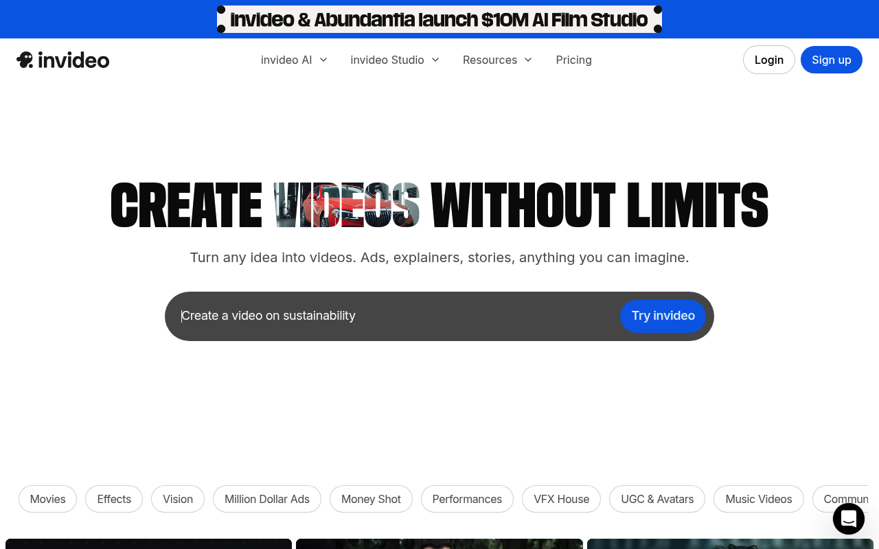 Invideo.io aborda el problema del tiempo y la complejidad asociados con la edición de videos. Utilizando IA, transforma contenido extenso como publicaciones de blogs o indicaciones en videos cortos, anuncios, explicativos, tutoriales o películas completas, permitiendo refinamientos basados en texto.