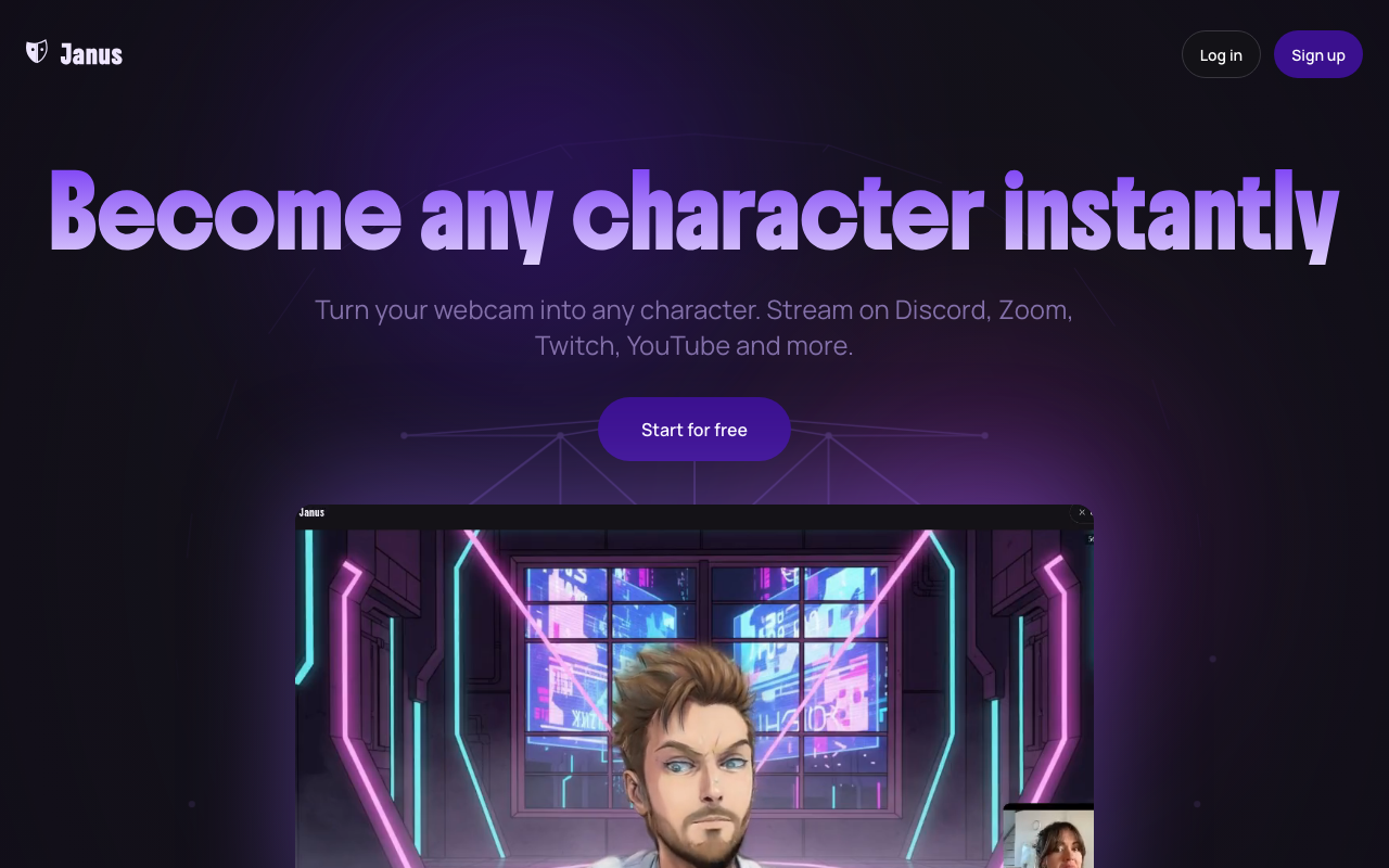 Janus es una plataforma de animación de personajes en tiempo real que usa tu webcam para transformar tu rostro en un avatar o personaje elegido. Está pensada para mantener tu expresividad mientras transmites con más privacidad y una estética más llamativa.