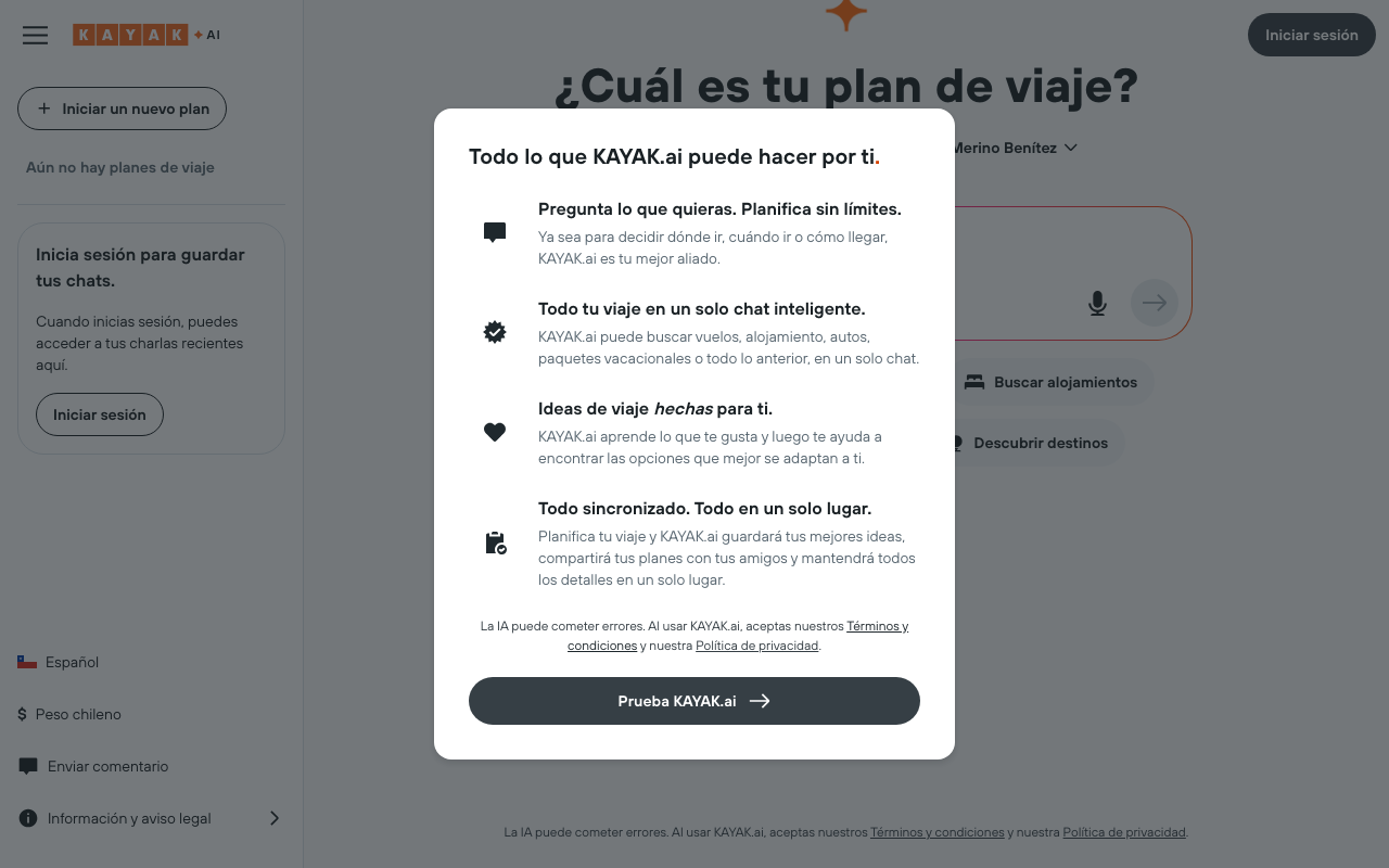 KAYAK.ai es el asistente de viajes con IA de KAYAK pensado para simplificar la búsqueda y planificación de viajes. Reúne recomendaciones personalizadas, precios en tiempo real y opciones de reserva en una sola experiencia, para que puedas comparar alternativas sin saltar entre múltiples sitios.