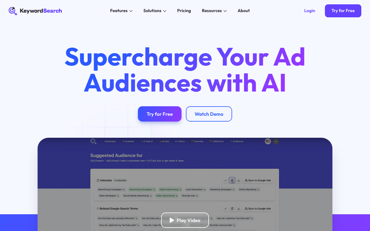 KeywordSearch ayuda a optimizar las campañas de anuncios, proporciona recomendaciones para nuevas ideas de video y mejora la investigación de palabras clave para SEO y SEM. Además, ofrece acceso a una base de datos de anuncios de YouTube para analizar estrategias de competidores y tendencias de la industria.