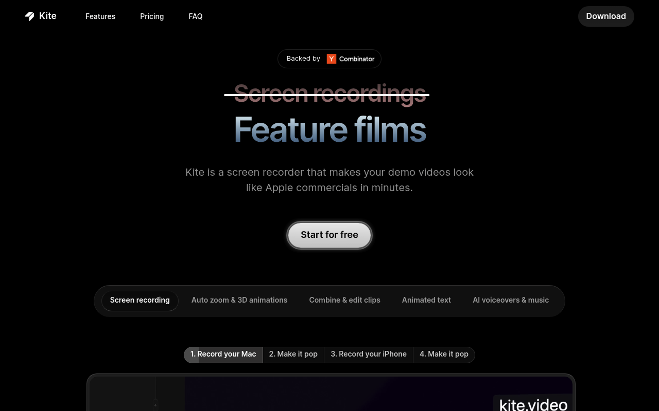 Kite.video es una herramienta basada en la web que permite grabar pantallas y transformar estas grabaciones en videos de marketing de alta calidad. Utiliza animaciones 3D cinematográficas, seguimiento de cursor y funciones de inteligencia artificial para mejorar automáticamente los videos de demostración de aplicaciones.