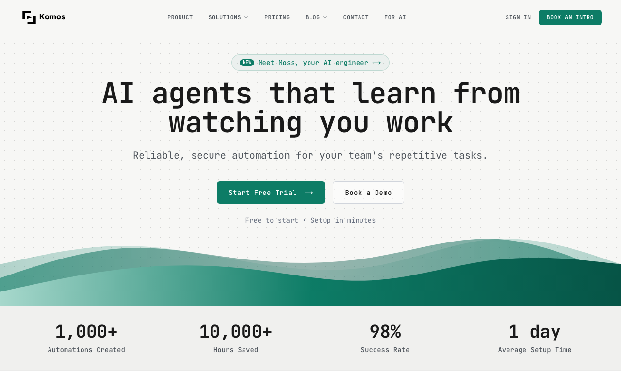 Komos es una plataforma de automatización de IA que aprende de tus acciones para automatizar tareas repetitivas de forma segura y eficiente.