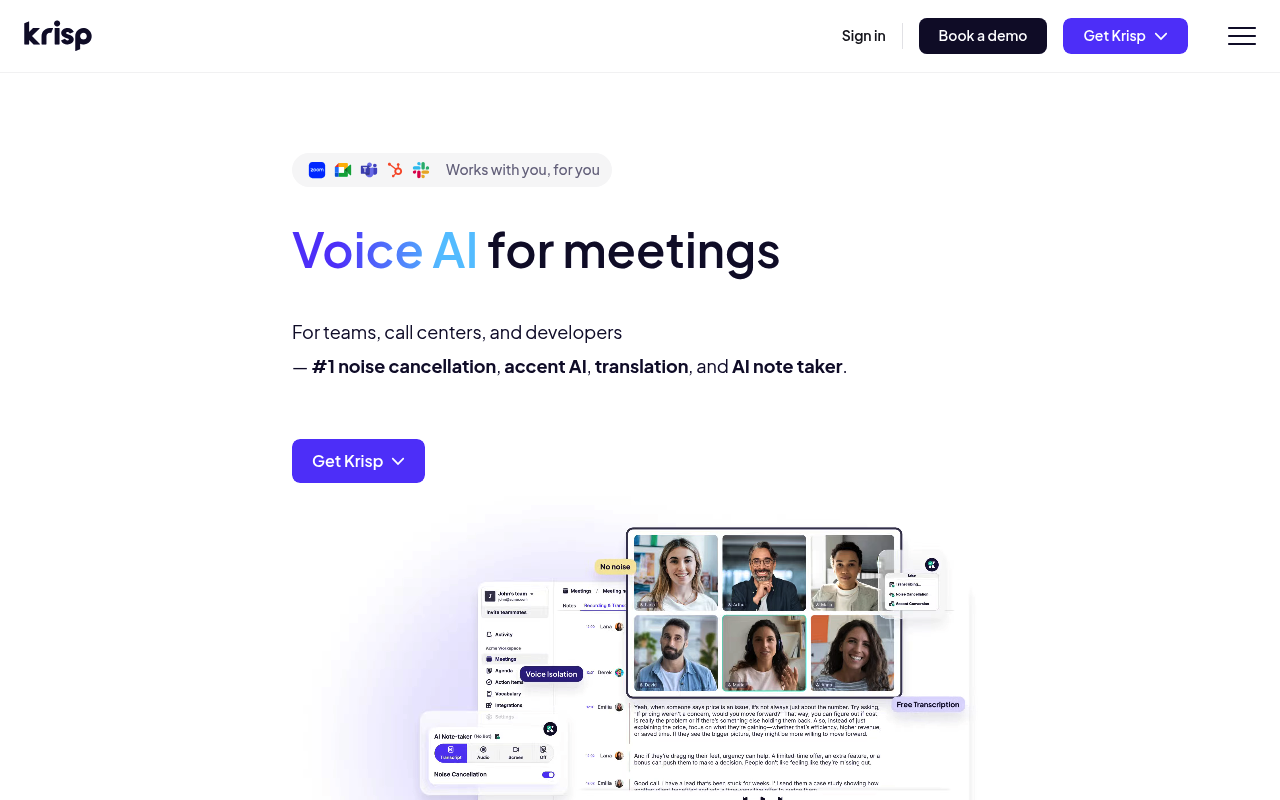 Krisp es una plataforma de inteligencia artificial diseñada para mejorar la calidad de las llamadas y reuniones virtuales mediante la cancelación de ruido en tiempo real y un asistente de reuniones con capacidades avanzadas.