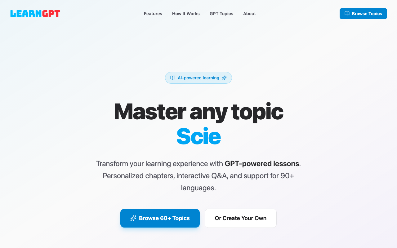 LearnGPT es una plataforma de aprendizaje impulsada por IA que genera currículos personalizados sobre prácticamente cualquier tema. A partir de un asunto que elijas, crea capítulos estructurados, lecciones guiadas y preguntas interactivas para practicar mientras avanzas.