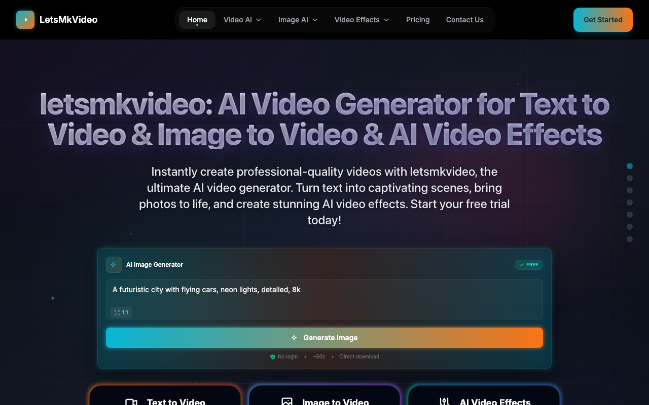 LetsMkVideo es una herramienta de generación de videos basada en IA que transforma textos e imágenes en videos profesionales con efectos de video AI.