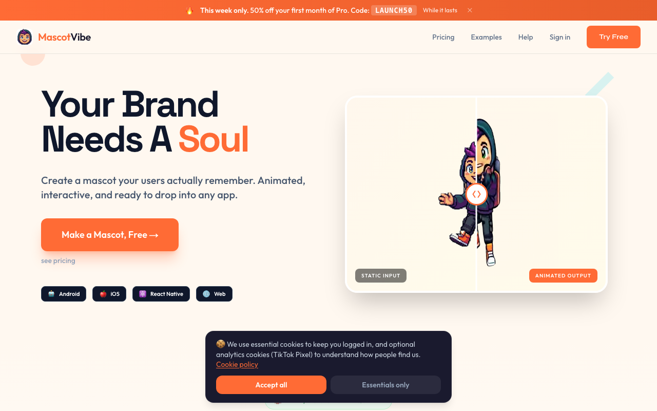 MascotVibe es una herramienta de IA que permite crear y animar mascots personalizadas para apps, juegos y marcas.