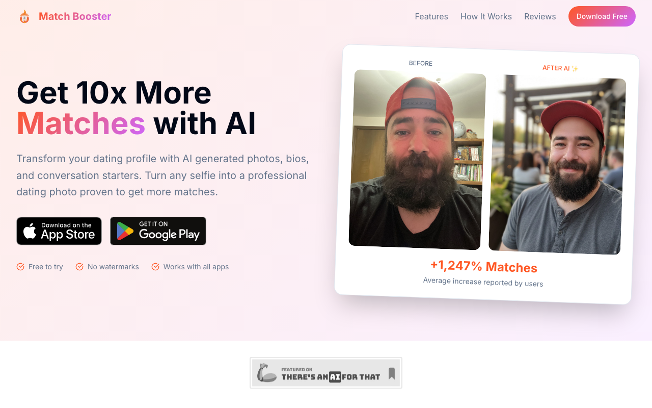 Match Booster es un kit de IA pensado para pulir perfiles de citas y ayudarte a destacar en apps como Tinder, Bumble o Hinge. Su enfoque está en mejorar la presentación personal para que tu perfil se vea más atractivo, claro y coherente.