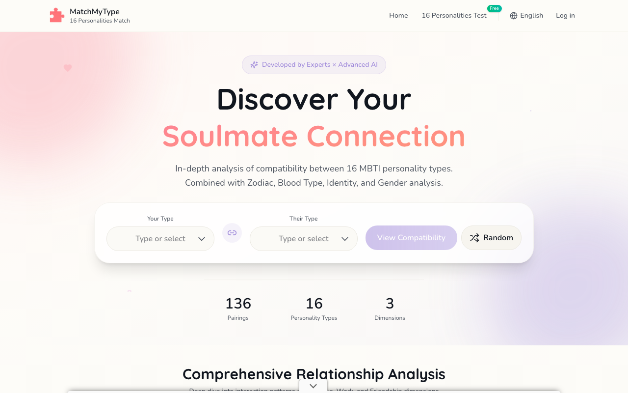 MatchMyType ofrece un análisis de compatibilidad basado en MBTI para explorar cómo interactúan dos personalidades en distintos contextos. La plataforma cruza los 16 tipos de Myers-Briggs y amplía la lectura con variables como zodiaco, grupo sanguíneo, identidad y género.