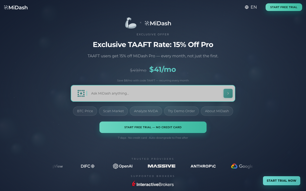 Su propuesta no se queda en un simple asistente de análisis. MiDash combina chat, construcción de estrategias, backtesting, escaneo de mercado y ejecución conectada a brokers en un solo flujo. Eso la vuelve atractiva para quienes buscan pasar de la idea a la acción con menos fricción y más control.