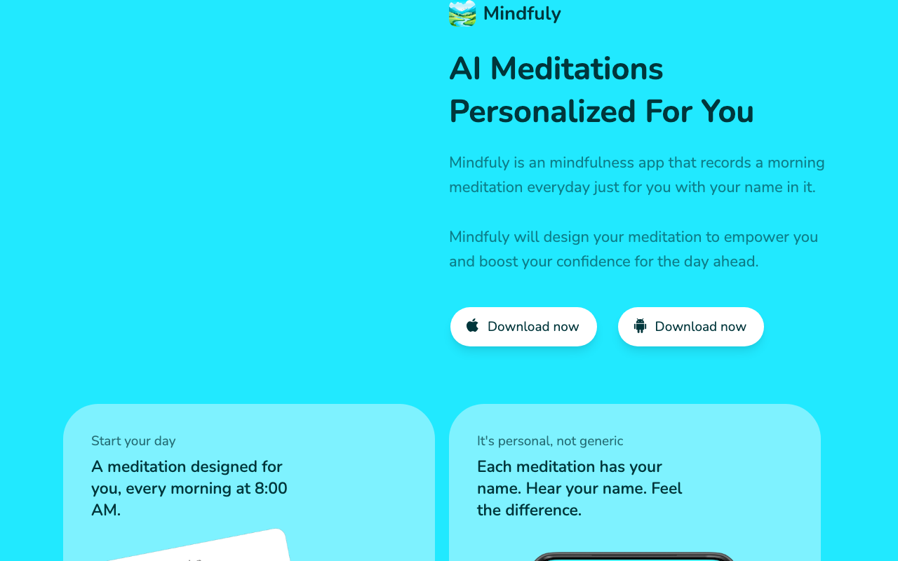 Mindfuly es una app de mindfulness impulsada por IA que te acompaña con meditaciones guiadas personalizadas, pensadas para empezar el día con calma y enfoque. La propuesta es simple y efectiva: cada mañana genera una experiencia distinta, adaptada a ti, incluyendo tu nombre para reforzar la sensación de cercanía y empoderamiento.