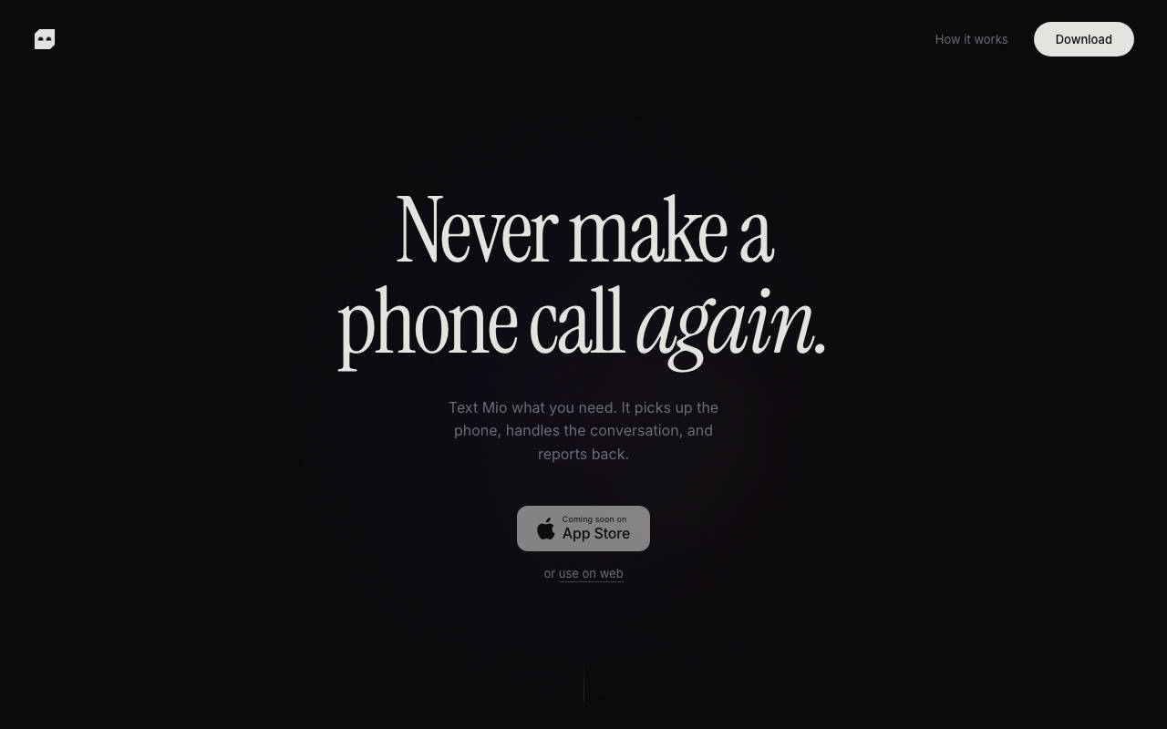 Mio es un asistente telefónico inteligente que maneja tanto llamadas entrantes como salientes en tu nombre. Puedes instruir a Mio simplemente enviando un texto, similar a enviar un mensaje a un amigo. Mio puede programar, reprogramar o cancelar citas, interactuar con sistemas automáticos y proporcionar un resumen detallado de cada llamada.
