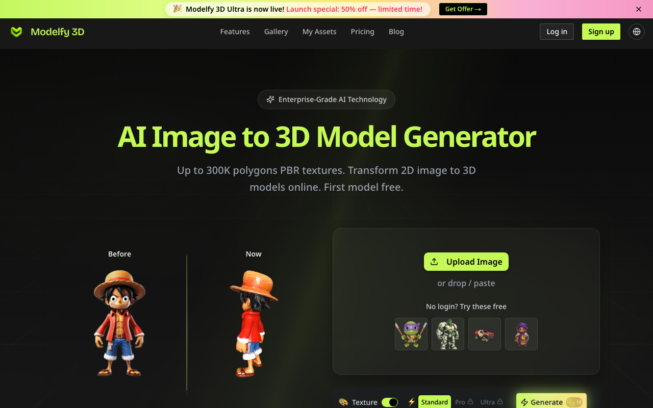¿Qué es Modelfy 3D? Modelfy 3D es una herramienta que utiliza tecnología de IA avanzada para convertir imágenes 2D en modelos 3D profesionales.