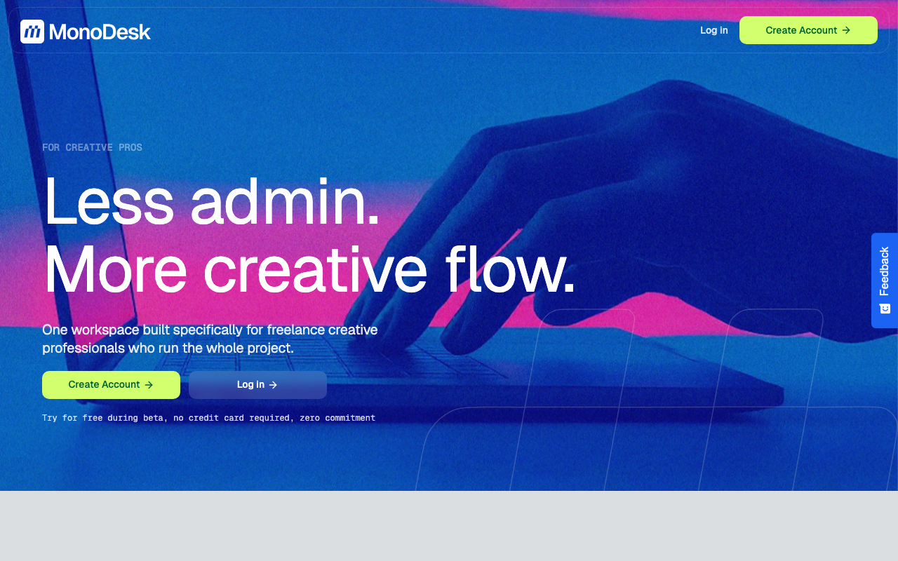 MonoDesk es un espacio de trabajo pensado para profesionales creativos freelance que necesitan ordenar proyectos, clientes y entregables sin perder el ritmo creativo. Su propuesta se centra en reducir el trabajo administrativo y evitar el cambio constante entre herramientas.