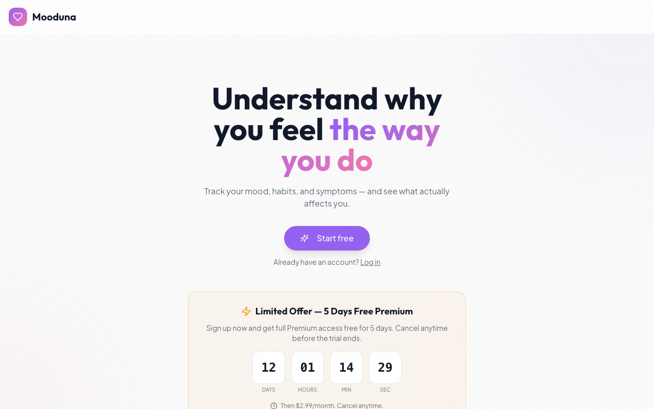Mooduna es una app de bienestar emocional enfocada en ayudarte a entender la relación entre tus hábitos diarios y tu estado de ánimo. Permite registrar emociones, síntomas y rutinas en pocos segundos, para luego mostrar patrones claros con el paso del tiempo.