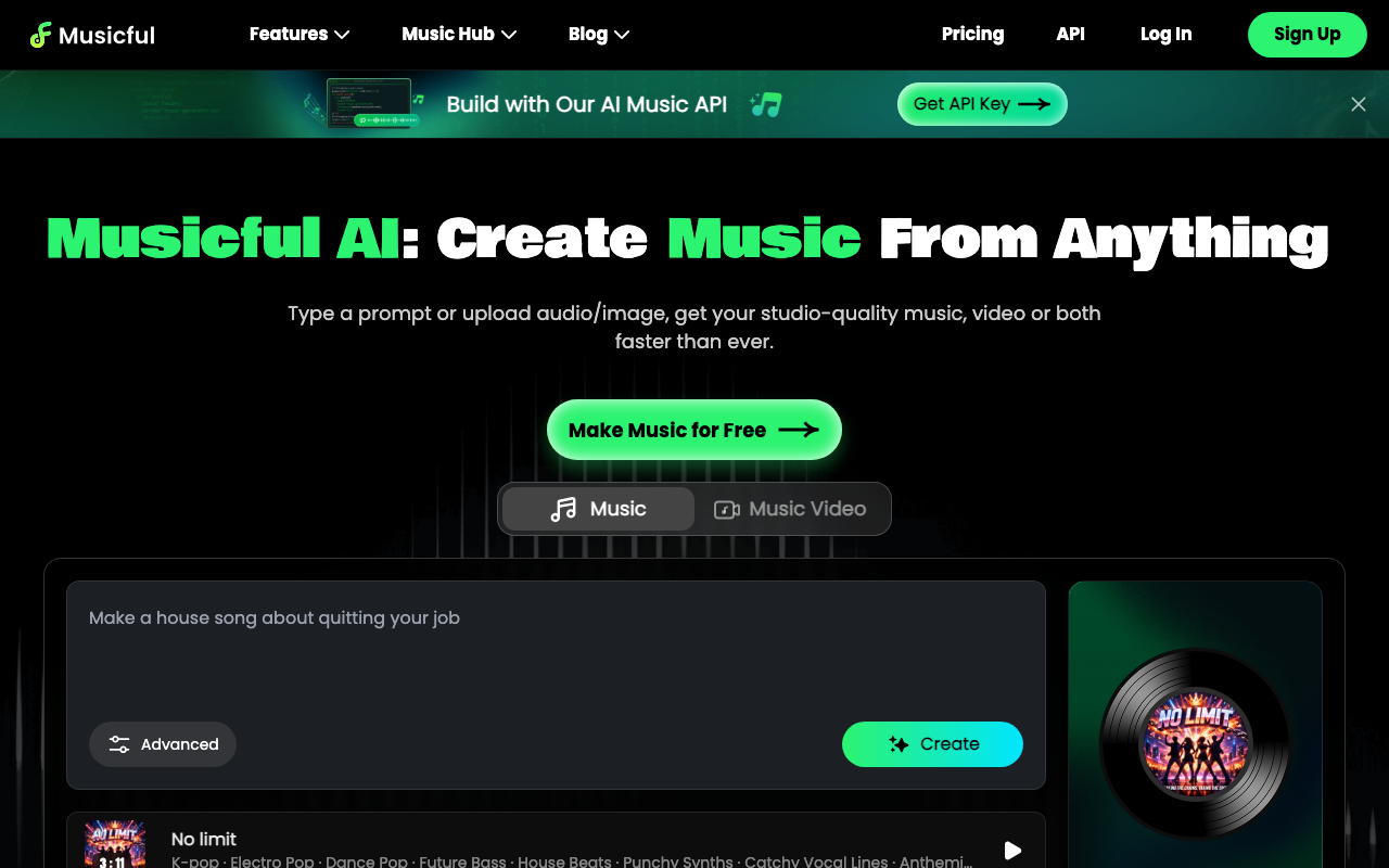 Musicful es una plataforma de inteligencia artificial de próxima generación con más de un millón de usuarios registrados. No es solo un generador de música, sino una comunidad donde puedes crear, descubrir y compartir música de forma instantánea. Con Musicful, puedes crear pistas vocales completas, ritmos pegajosos o remixes personalizados simplemente escribiendo, pegando o tarareando lo que tengas en mente.
