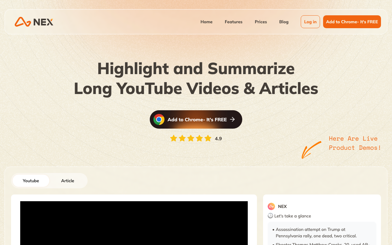 Nex es un copilot de conocimiento con IA pensado para absorber información más rápido. Funciona como extensión de Chrome y resume videos de YouTube, artículos web y PDFs, resaltando los puntos clave para que no tengas que leer o mirar todo de principio a fin.