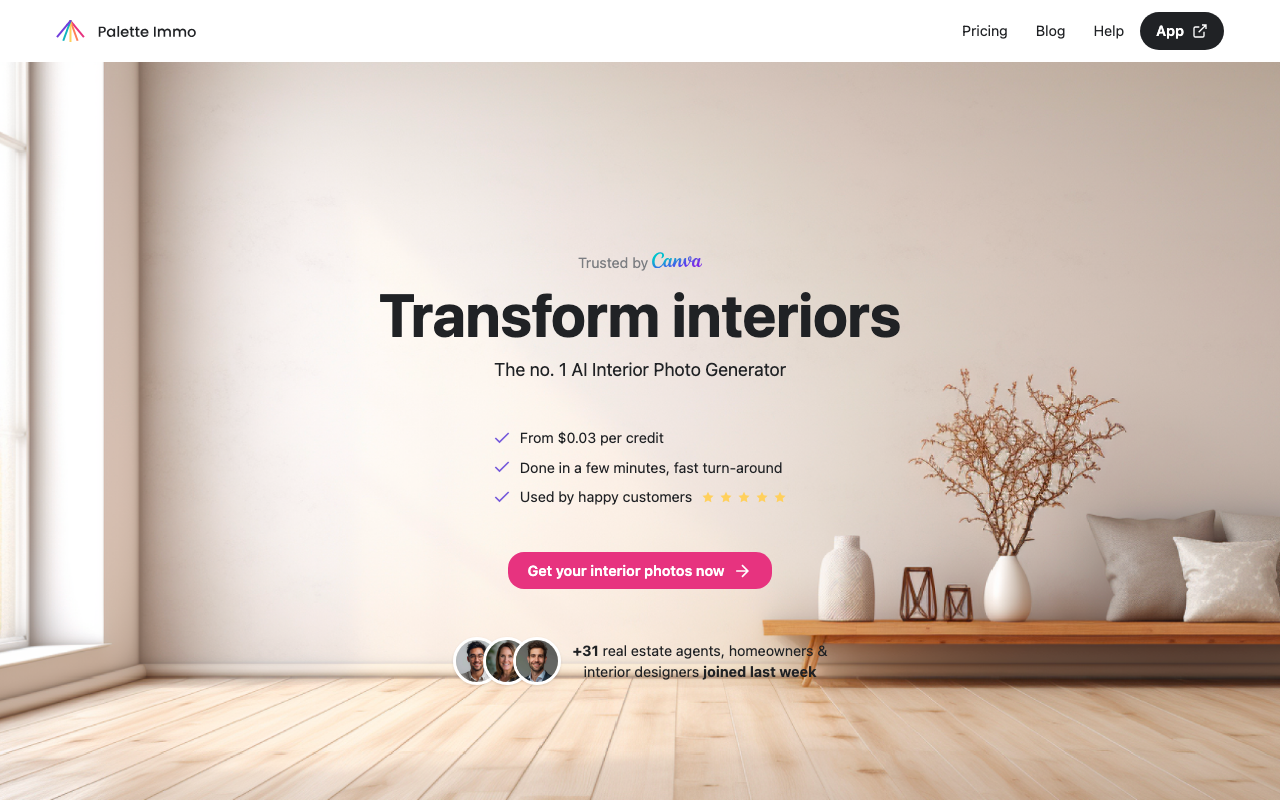 Palette Immo es una plataforma de IA enfocada en interiorismo y presentación inmobiliaria. Permite transformar fotos de espacios vacíos o amueblados en visualizaciones más atractivas, con staging virtual, rediseño y renders rápidos en más de 30 estilos.