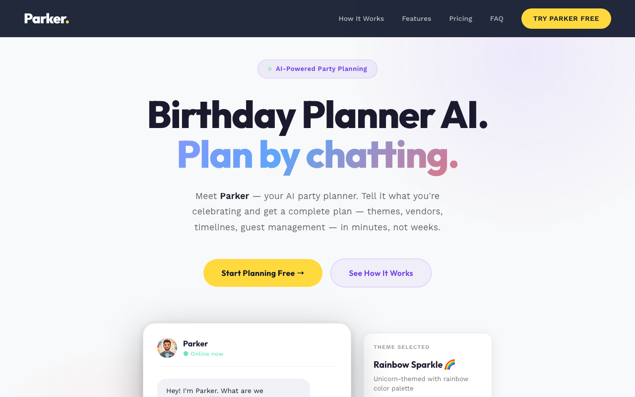 A diferencia de plantillas genéricas, Parker adapta el plan al interés del celebrante y genera una propuesta temática coherente. Además de ideas creativas, incluye checklist, timeline del día, gestión de RSVPs, estimación de presupuesto y sugerencias de proveedores en un solo flujo. Su enfoque pay-per-party y la promesa de planificar en pocos minutos lo hacen atractivo para quienes solo necesitan organizar una celebración puntual.