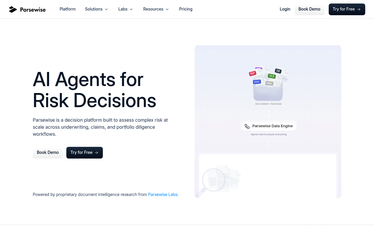Parsewise.ai es una plataforma de decisión impulsada por agentes de inteligencia artificial que automatiza la extracción, validación, estandarización y análisis de documentos no estructurados. Está diseñada para generar información estructurada y lista para la toma de decisiones en sectores como seguros, reaseguros, cumplimiento normativo y suscripción financiera.
