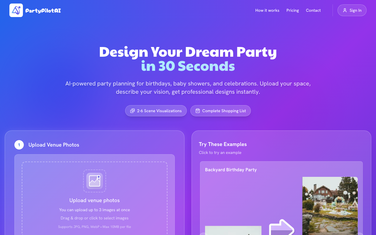PartyPilotAI es una plataforma de planificación de eventos impulsada por IA que convierte fotos de un espacio en propuestas de decoración y distribución listas para ejecutar. Está pensada para quienes quieren organizar una fiesta sin perder tiempo en bocetos, referencias dispersas o pruebas manuales.