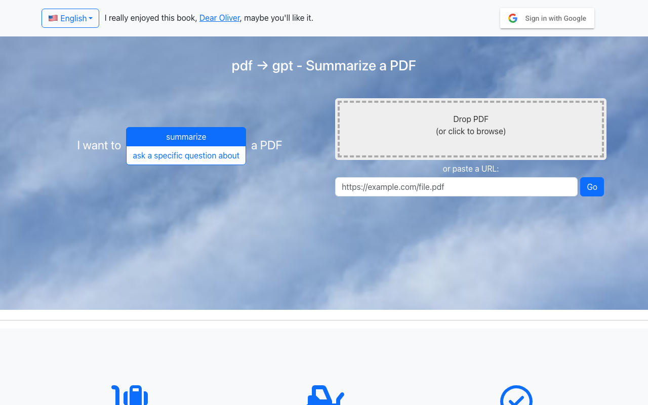 pdf2gpt convierte documentos PDF largos en resúmenes claros y accionables usando GPT. Su enfoque no se queda en fragmentos sueltos, sino que procesa el archivo completo para ofrecer una visión más útil del contenido.