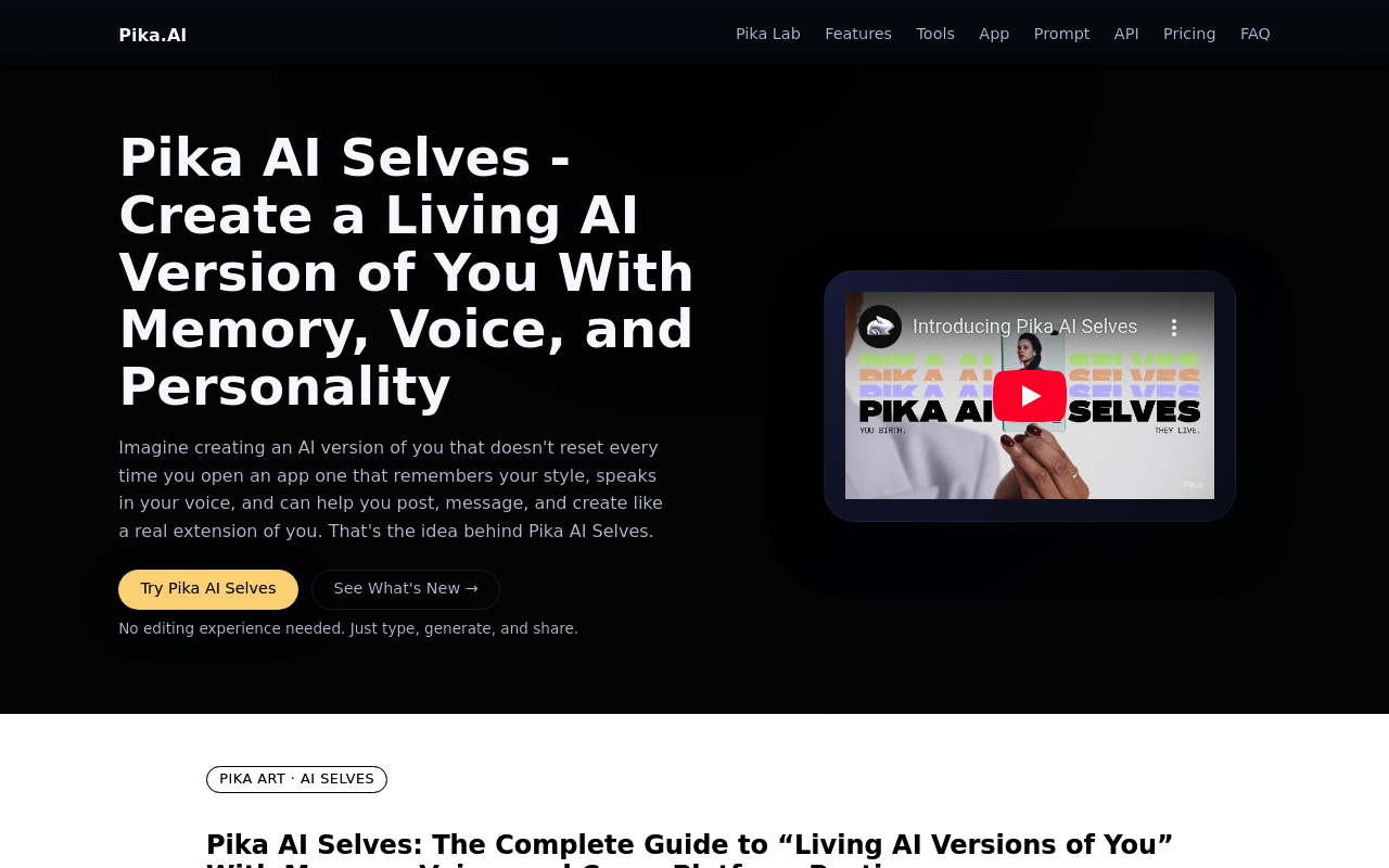 Pika AI Selves es una herramienta de inteligencia artificial basada en la web desarrollada por Pika Labs. Permite a los usuarios crear "gemelos digitales" personalizados, que son extensiones de sí mismos con memoria, personalidad y capacidades multimodales. Estos gemelos digitales pueden realizar tareas creativas, sociales y autónomas, como chatear, crear contenido o integrarse con aplicaciones.