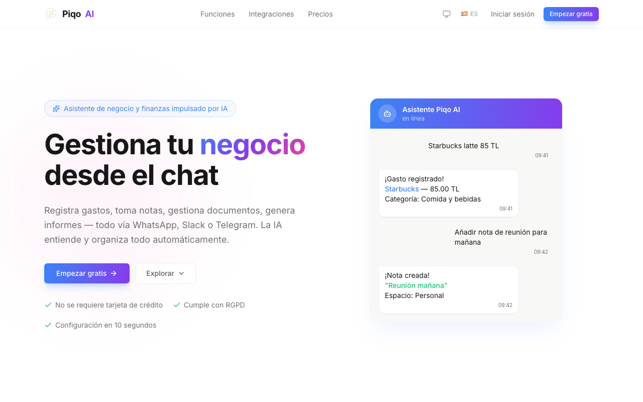 Piqo AI es un asistente de negocios y finanzas impulsado por IA que simplifica flujos de trabajo y la comunicación a través de plataformas de chat.