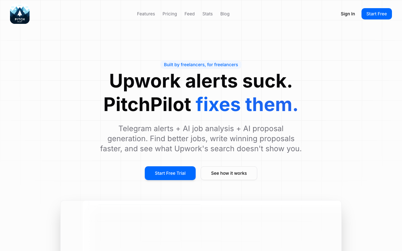 Pitch Pilot ayuda a freelancers y agencias que trabajan en Upwork a detectar oportunidades antes que la competencia y a redactar propuestas más sólidas con apoyo de IA. Combina alertas en tiempo real por Telegram con un panel web para seguir vacantes, organizar perfiles y generar propuestas desde cualquier lugar.