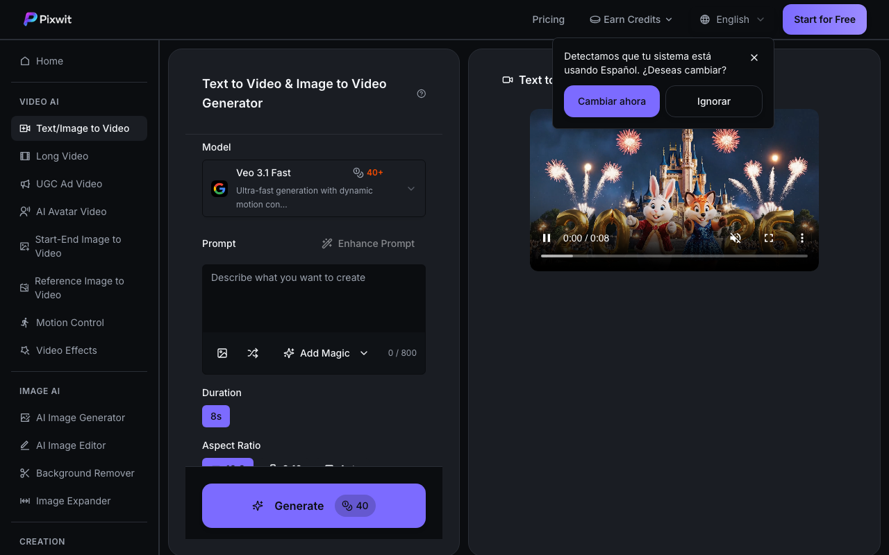 Pixwit AI es un generador de video que transforma ideas en secuencias listas para publicar. Puedes crear clips cinematográficos a partir de texto, animar imágenes con distintos estilos y también trabajar con referencias visuales para mantener coherencia en la historia.