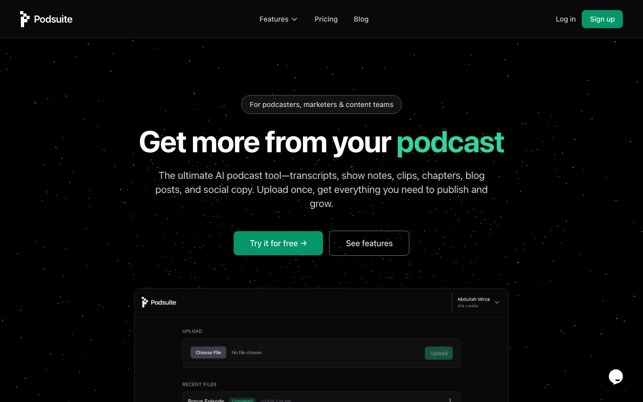 Podsuite es una plataforma de IA pensada para sacar más provecho de cada episodio de podcast. A partir de un solo archivo de audio, genera transcripciones con identificación de hablantes, show notes, capítulos, palabras clave, títulos sugeridos y piezas listas para reutilizar.
