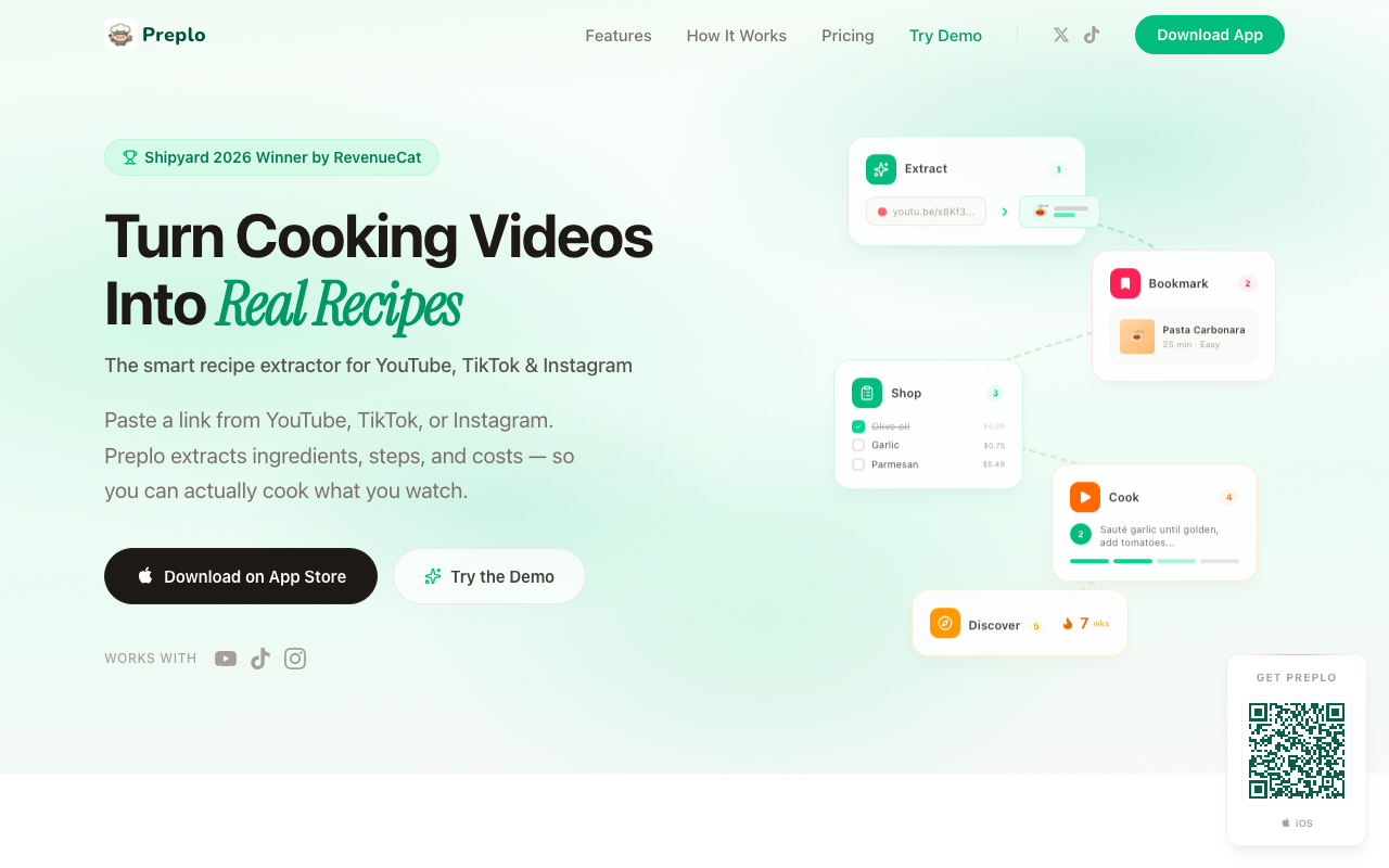 Preplo convierte videos de cocina de YouTube, TikTok e Instagram en recetas completas con ingredientes, instrucciones y costos estimados automáticamente.