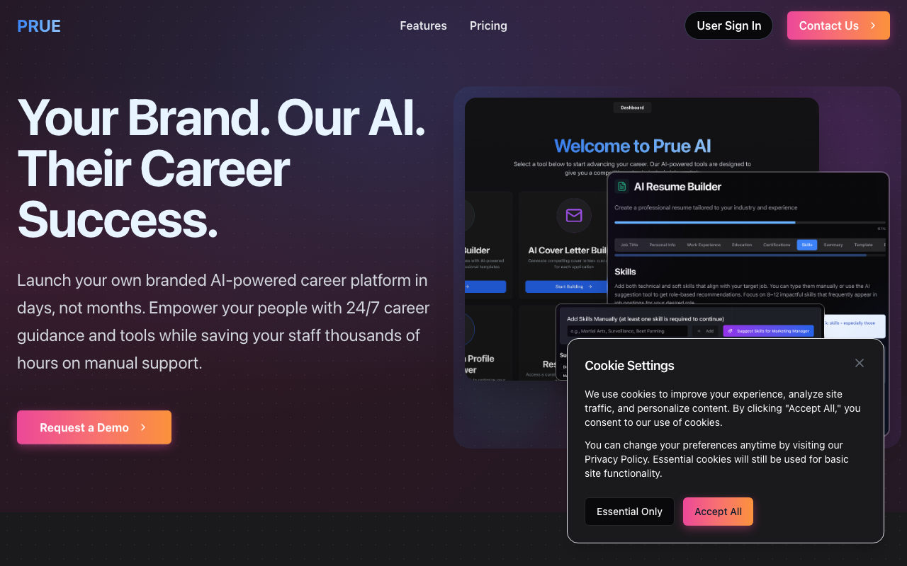 PruE AI es una plataforma de inteligencia artificial diseñada para simplificar y acelerar cada etapa de tu trayectoria profesional. Ya sea que estés buscando cambiar de carrera, volver al mercado laboral o ascender en tu campo, PruE AI proporciona todo lo que necesitas, desde la creación de currículums y cartas de presentación hasta la preparación de entrevistas y el análisis de brechas de habilidades.